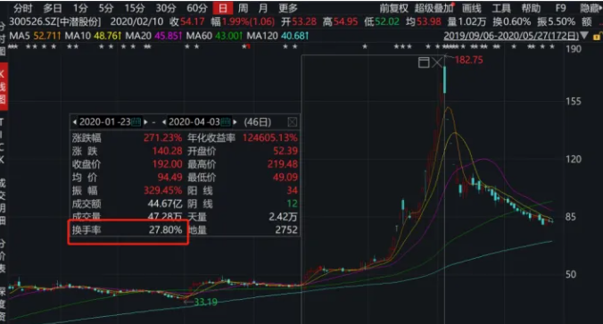 比如中潜股份最疯狂的2020年1月到4月,46个交易日股价涨了271%,但是区间换手率只有27.8%,每天的换手率只有0.6%。如果不是庄股的话,随着股价的上涨,分歧越大,换手率越高。只有庄股,主要股份都被庄家持有,拉升股价非常容易,换手率不会很高。