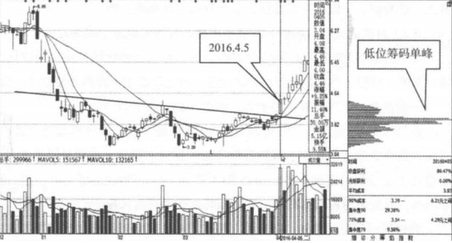 (4)当高位筹码渐渐转移至低位,且低位筹码单峰足够大的时候,就是主力即将启动拉升的时刻。