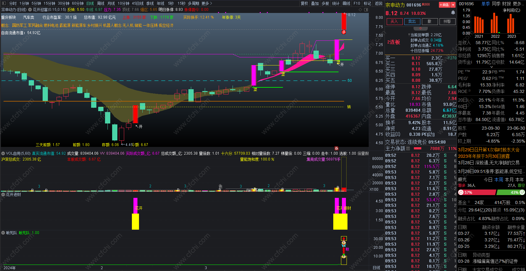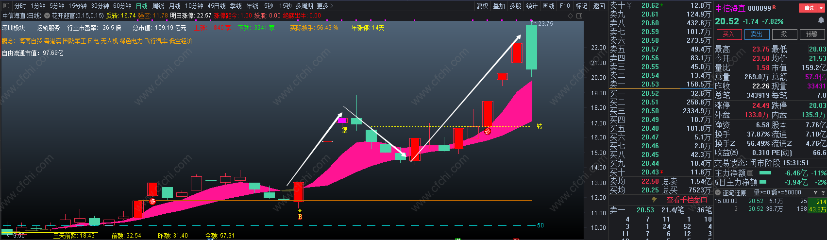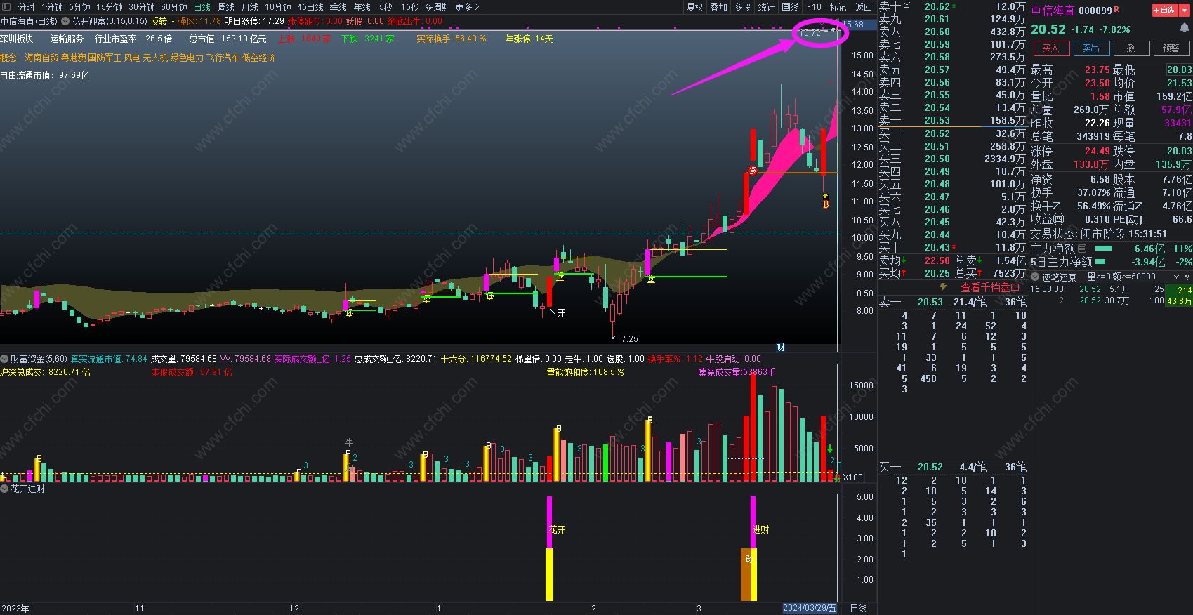 第二,综合分析找热点题材跟踪,先看看上面中信海直的图,有城堡一阶比不阶高,对吧?1月24日首次有花开,然后用了近一个月时间调整洗盘,这一个月时间是不再次建立了城堡?2月22日的顶破没破?是不是一直没破,并站了50线,同时色带是不是后面开始转紫色,这也是筹码高度集中了,3月12日第一个涨停板开始发动了行情(当然这是马后炮),但是我们看看2板后的调整,3月26日并不破首板的顶、3月27日直接上板,这时是不是应该对低空经济有一个理性的判断了?是不是应该做做低空的功课了?