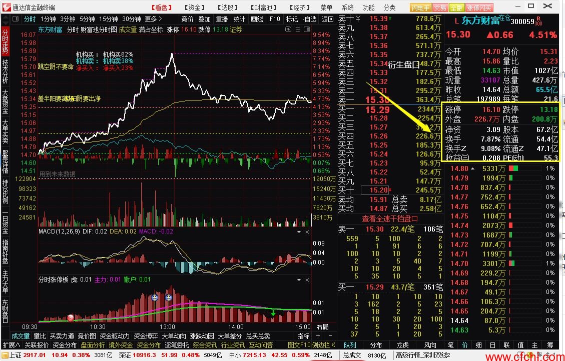 盘口的衍生数据是在基础数据上通过数学公式计算得来,包括买手、卖手、内 盘、外盘、委比、委差、量比、换手率、总量等,如下图所示: