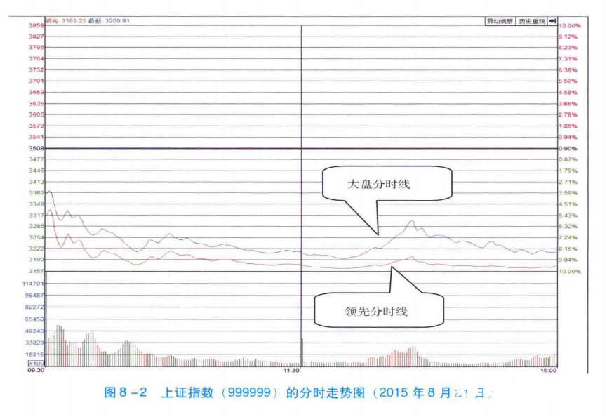 如图8-2所示,2015年8月24日,上证指数在盘中持续下跌的同时,领先分时线一直位于大盘分时线下方,形成了更大的跌幅。这样的形态说明当日盘中小盘股的下跌要强于大盘股,在整个市场中领跌。