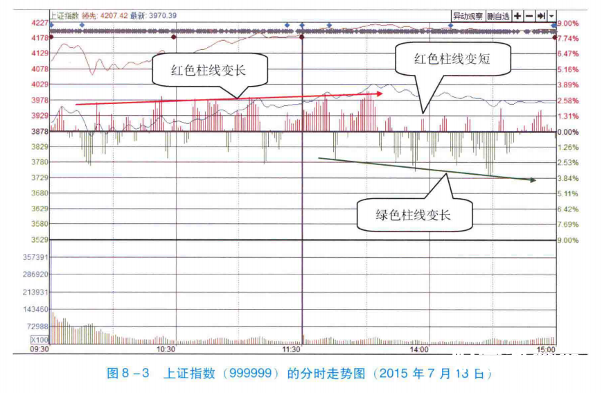 如图8-3所示,2015年7月13日上午,上证指数的红色柱线逐渐变长,这是市场上多方力量持续强势的信号。在多方力量的持续推动下,指数也持续上涨。