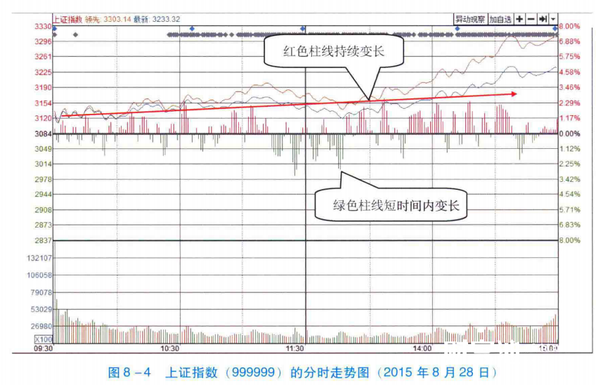 如图8-4所示,2015年8月28日,上证指数的红色柱线在整个交易日内都在持续变长。这样的形态说明市场上买入股票的多方力量持续强大。当日,在强大的多方力量的推动下,该股取得了比较大的涨幅。