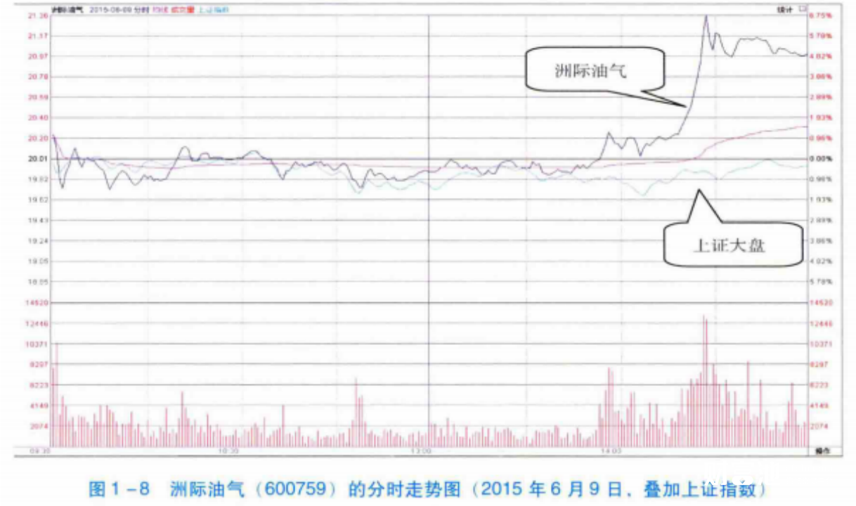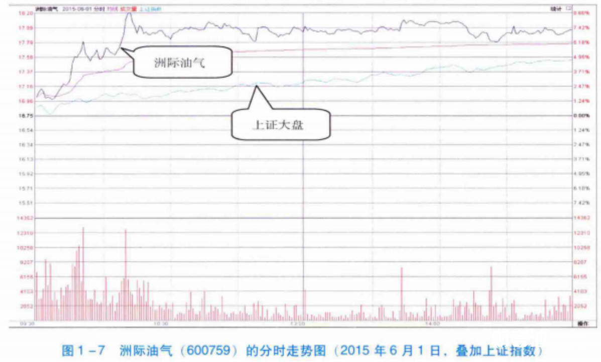 图1-7所示,2015年6月1日,上证大盘指数持续上涨。同时,洲际油气(600759) 的分时走势也持续向上,并且涨幅超过了上证指数。