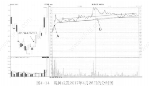 如图4-14所示,在陇神戎发2017年4月26日的分时图中,A段走势是开盘后的强势拉升,B段走势是全天的长时间横向震荡。实盘较强的主力拉升个股时,一般会选择在早盘阶段,特别是开盘之后,但在主力拉升的起步阶段,主力并不确定市场抛压,通过早盘主力拉升至盘中高点,随后,减小买入力度,以此来判定市场抛压。