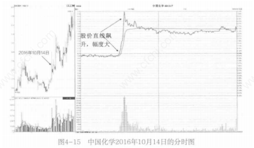 结合图4-15来看,中国化学早盘飙升幅度大,且上扬形态十分流畅,说明主力拉升的力度较大。但在盘中高点却失去了支撑,股价下滑至均价线下方一直到收盘。这表明当日的盘中逢高抛压较重,该股有短线回调整理的需要。