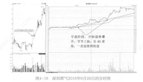 如图4-16所示,在深圳燃气2016年6月28日的分时图中,开盘后,该股运行平稳,并在10:30左右开始了震荡攀升的走势,之后股价节节上扬。这种震荡上升的节奏一直持续到收盘,当日的长阳线使得股价一举突破了低点整理平台。根据这种盘口形态再结合日K线图,可以判断这是低点位多方力量蓄势充分、主力拉升的信号。