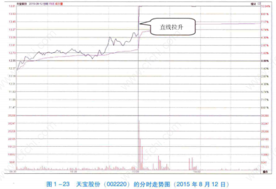 图1-23为天宝股份2015年8月12日的分时走势图。将这张图与图1 -21结合起来就可以看出,当日上午该股的走势并不强,但是在下午刚开盘就形成了直线拉升的行情。