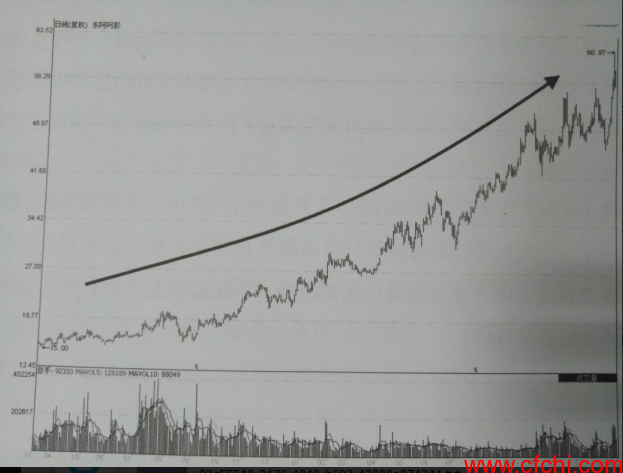 如图1所示为东阿阿胶2009年3月至2011年1月期间走势图,从走势图中可以看到,此股虽然在短期内的波动幅度较大,但是在这一年半左右的长期时间跨度内,其走势有着明显的方向,即上升方向。这种整体向上的运行态势正是上升趋势。