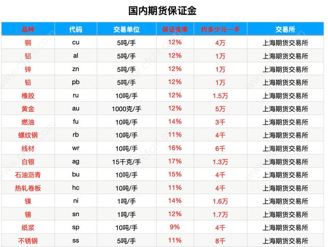 (国内商品期货保证金一览表)