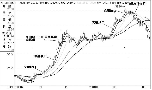 (3)持续性缺口:在上升或下跌途中出现缺口,可能是持续性缺口。这种缺口不会和突破缺口混淆,任何离开形态或密集交易区域后的急速上升或下跌,所出现的缺口大多是持续性缺口。这种缺口可帮助我们估计未来后市波幅的幅度,因此,也称之为量度性缺口。