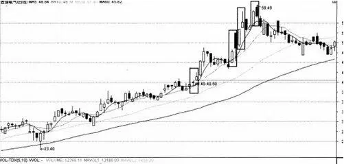 此类跳空反映出市场正以中等的交易量顺利地发展。在上升趋势中,测量缺口的出现表明市场坚挺;而在下降趋势中,则显示市场疲软。正如突破跳空的情况一样,在上升趋势中,持续跳空在此后的市场调整中将构成支撑区,它们通常也不会被填回,而一旦价格重新回到中继跳空之下,那就是对上升趋势的不利信号。