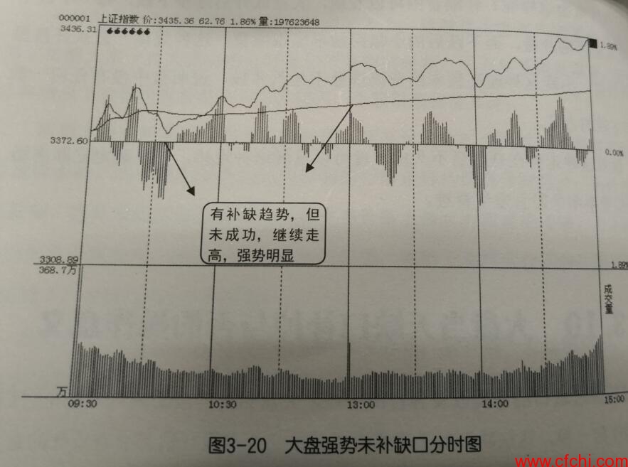 如图3-20所示是大盘某天的分时走势图, 图中显示当天指数出现高开,在 十点过有明显的一波回补缺口趋势, 但最终并没有补缺成功,指数再次上均线, 随后便单边上扬走高根率较大, 正因为科能没有成功说明当天大盘走势强势,指数当天维续 因此当数科次上均线时就是入场时机,短线获利根率非常大,