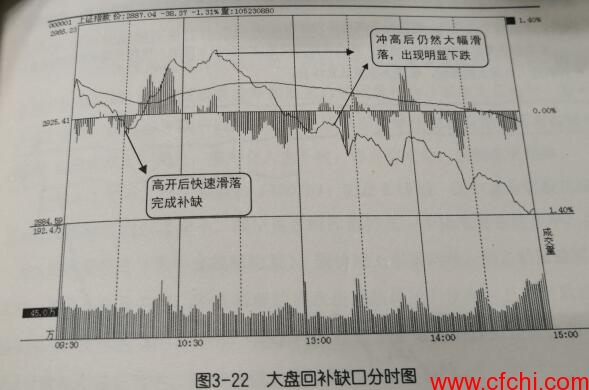 如图3-22所示,大盘高开回落回补缺口,尽管补缺后出现-波拉升,但最终仍然下跌。