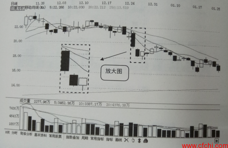 (3)在下跌的第二天股价出现向下跳空,并收出一根阴线,第三天股价出现一定反弹,但幅度相当有限,最终收在前一根阴线缺口的下方附近。