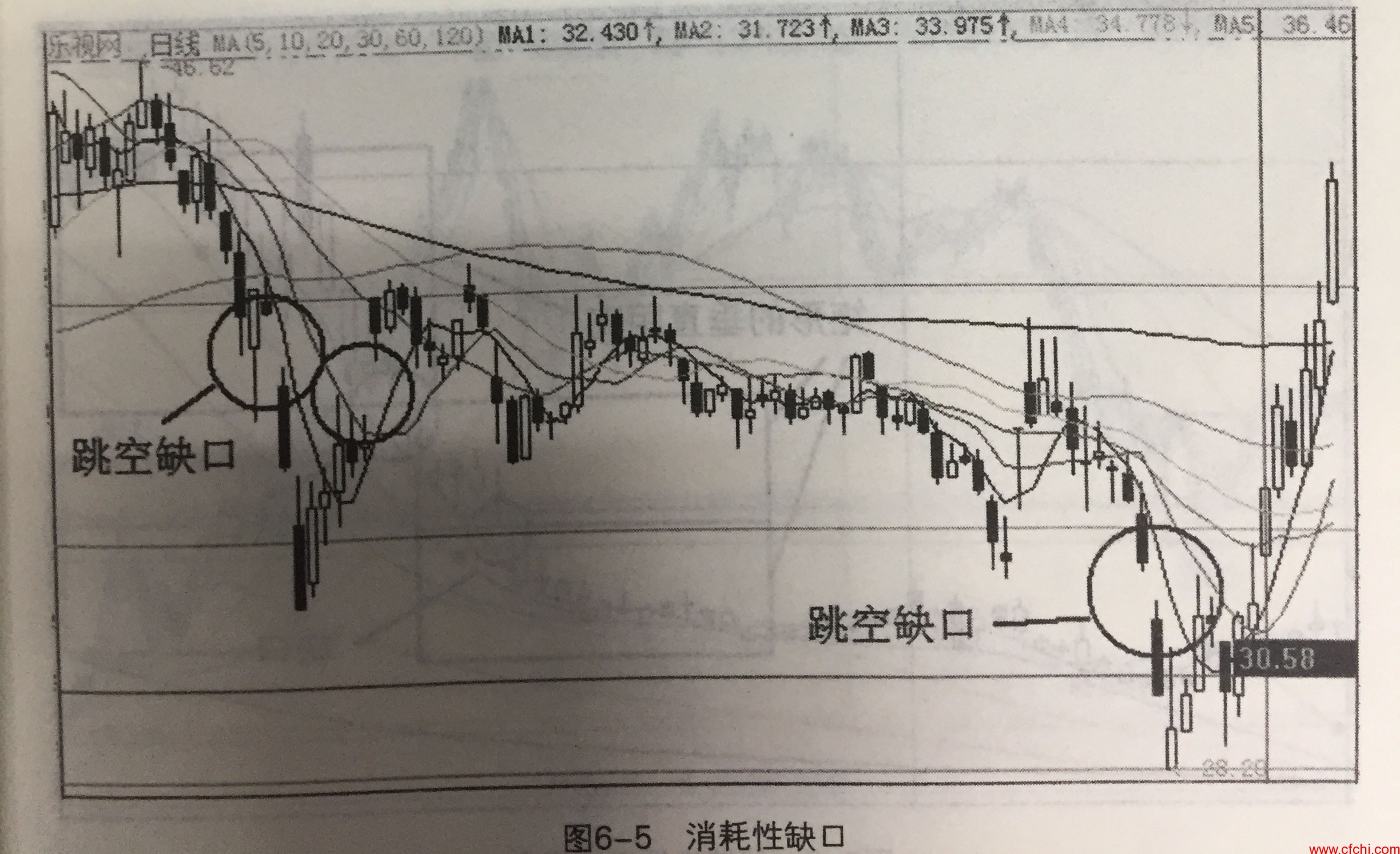 消耗性缺口:大多在恐慌性抛售或消耗性上升的末段出现。在急速的上升或下跌中,这时价格的跳升(或跳空下跌)可能发生,此缺口就是消耗性缺口。所以此缺口也叫竭尽缺口或衰竭缺口。