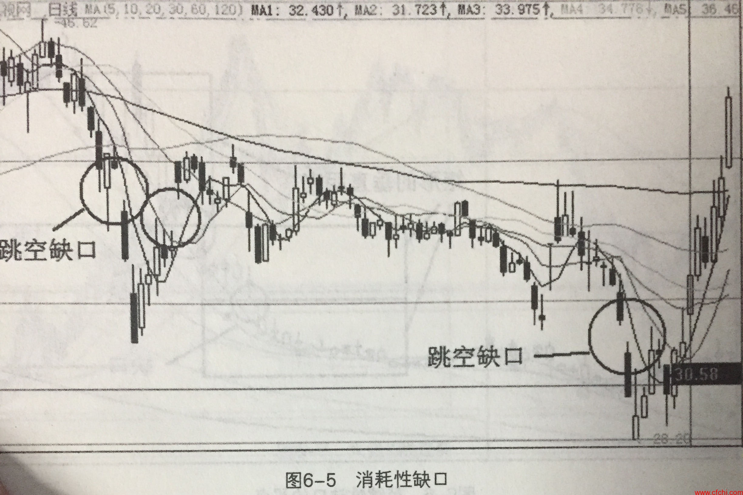 消耗性缺口:大多在恐慌性抛售或消耗性上升的末段出现。在急速的上升或下跌中,这时价格的跳升(或跳空下跌)可能发生,此缺口就是消耗性缺口。