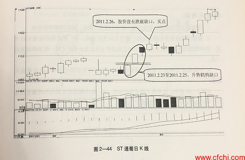 如图2-44所示,经过前期震荡之后,从2011年2月23日至2月25日,ST通葡(600365)出现升势鹤鸦缺口形态,发出看涨信号。2月26日,该股股价继续上涨,没有跌破形态缺口,买点出现。