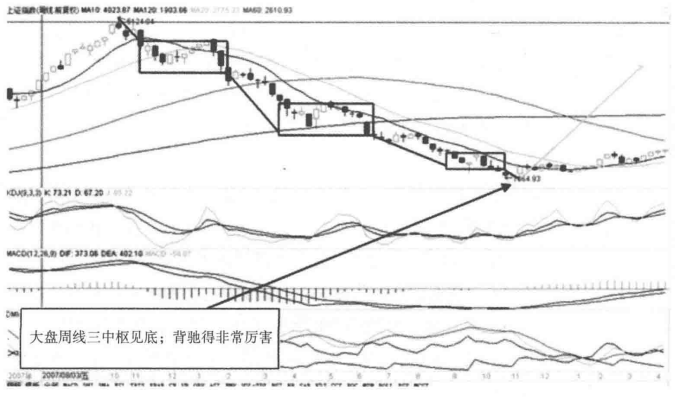 第三步:精确定位现在的大盘位置是高是低,是买点还是卖点?比如在尾数逢7的年份,是大牛市,也是“飞涨”,那么如果出现了指数周线两中枢背驰,或者三中枢背驰的卖点,那么就可以判顶成立。如果是在尾数为9的年份,指数又出现了周线三中枢背驰见底,日线四中枢背驰见底,那么毫无疑问就是底了。