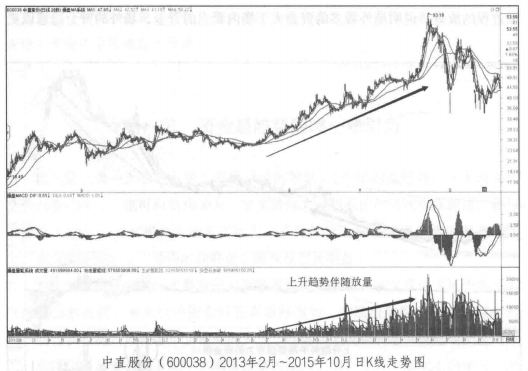 下图的中直股份( 600038)的走势也说明,不管是强势的上涨还是缓慢的通道式上涨,上升趋势的运行必须伴随放量。虽然中直股份的上升趋势不是非常流畅,但是在整个上涨过程中量能也呈现出了逐渐上升的趋势。笔者在不看K线和任何指标只看成交量的情况下就可以进行交易的原理就在于此。