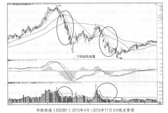 华联综超( 600361)的下降趋势也是对下降趋势缩量的一个验证,在第一波快速杀跌的初期量能有初步放大的过程,后期就属于典型的场内筹码抱有幻想式惜售,量能持续萎缩,股价持续创新低。在做了简单的头部之后,股价走出了明显的下降趋势。所以在下降趋势中对于量价的分析要和上升趋势有明显的区别。