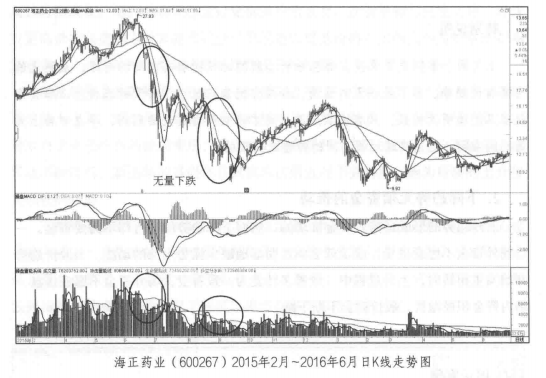 如图所示,海正药业( 600267)的每一波下跌都是比较勐烈的,但是从图中可以清晰地看到,在下跌速度最快的过程中量能是在缩小的。有的时候投资者会被这种现象麻痹,因为始终觉得无量下跌是好事,但是这种情况在上升过程中是适用的,当趋势转为下跌后就完全不适用了,因为下跌不需要量能的推动,一旦趋势形成了反转,无量下跌是没有底的。