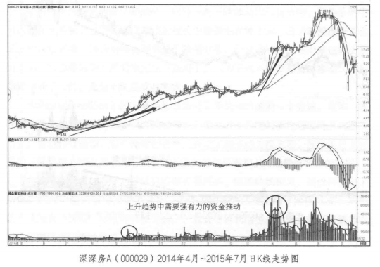 如图所示,从深深房A ( 000029)的整个上升趋势中可以看出,每个波段的上涨必然有量能放大的过程,而且上涨角度越大的波段释放出来的量能越大。上涨过程的放量,说明场外看多的资金大于场内看空的资金,场外的资金愿意以更高的价格成交,场内的筹码愿意以更低的价格成交,这就很容易促成交易。