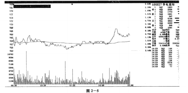 如图2-5所示,该股上午开盘后,经过短暂的多空搏斗开始一路震荡走软。它在下午14: 15分之后开始发力,很快就把股价拉起,这时大盘也开始走强,整个盘面大部分个股都出现了拉高的现象。最后收盘的时候,股价收于开盘价之上。