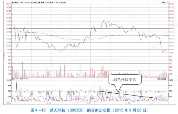 如图4-15所示,2015 年8月26日,楚天科技(300358) 下午结束反弹后开始持续下跌。在股价下跌过程中,其买卖力道指标一直保持绿色柱线,并且柱线的长度越来越长。这样的形态说明随着行情的下跌,越来越多的投资者抛出股票,未来下跌行情将会持续较长时间。看到这样的形态时,投资者应该尽快抛出手中的股票。