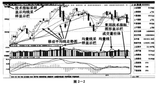 移动平均线线采样显示栏可以显示三个不同时间周期的移动平均线在该日的数值。例如,本栏最前面的“MA5 3203. 77”,表示的含义是,最后一个交易日的上证指数5日均线收于3203. 77点。其它均线表示含义与此相同。