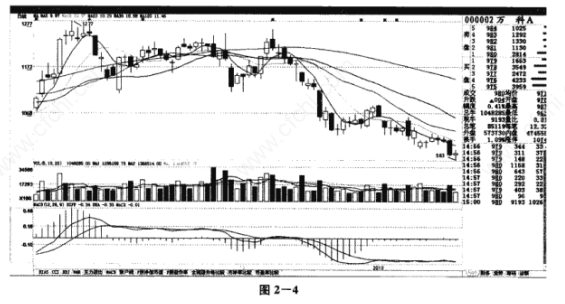 个股K线走势图从周期上可以分为5分钟K线图、15分钟K线图、30分钟K线图、60分钟K线图、日K线图、周K线图、月K线图。图2-4是万科A 000002) 的日K线走势图,其看法可以参阅“大盘K线走势图”和“个股分时走势图”。