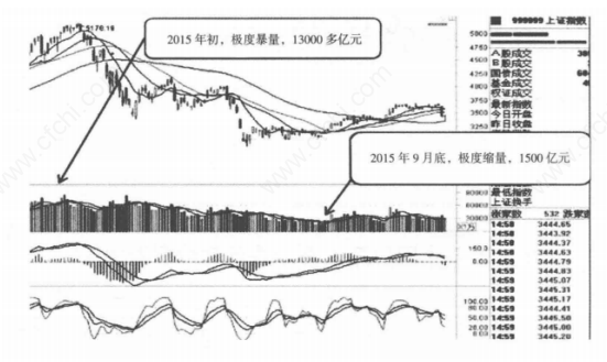 理论上缩得越狠,涨幅越大,如果成交额只缩到一半左右,最多出现反弹行情。2015年9月底,中国沪深A股市成交额已经缩到1500亿元,而年初在5000点高位时中国沪市A股成交量是13000多亿元,几乎缩到了1/10 的水平,股市于是开始孕育一波比较可观的行情。
