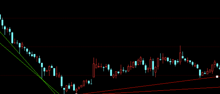 趋势线反映的是当前市场的运动方向,如果是下降趋势,低点之间的连接,是否会形成从左向右上方的趋势线,如果能在下降趋势找到一条上升的趋势线,那说明市场行情发生了转变。如下图所示: