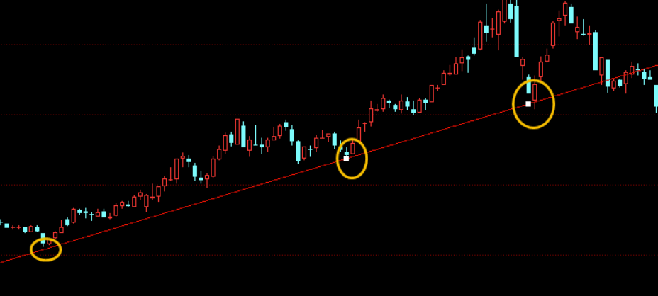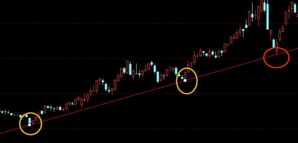 趋势线的第二个作用————支撑位。如下图所示: