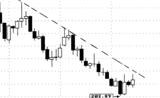 1、首先要正确的做出趋势线,确定是由两个依次下跌的高点做出的,要把下跌中的所有价格变化涵盖其中;
