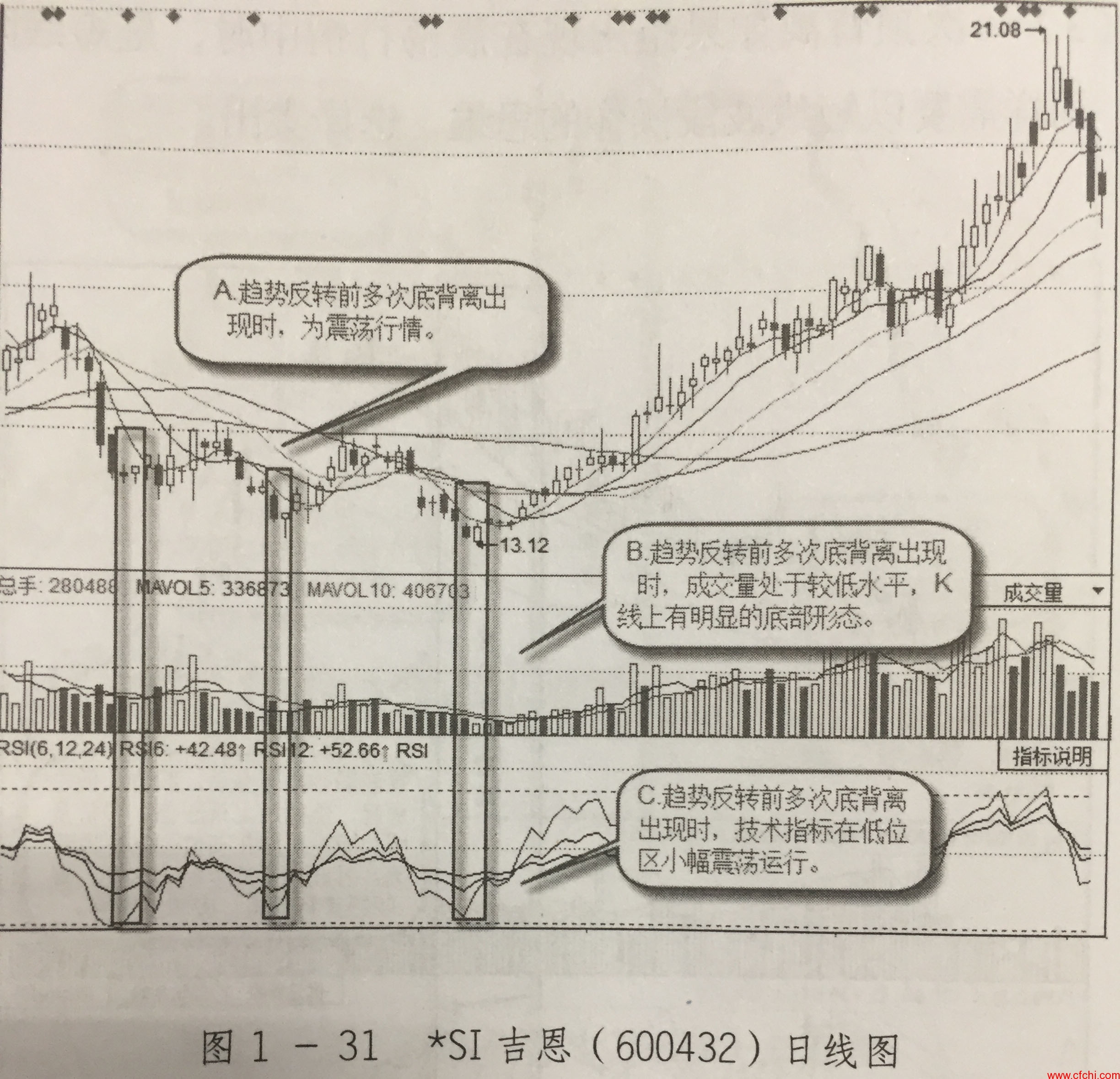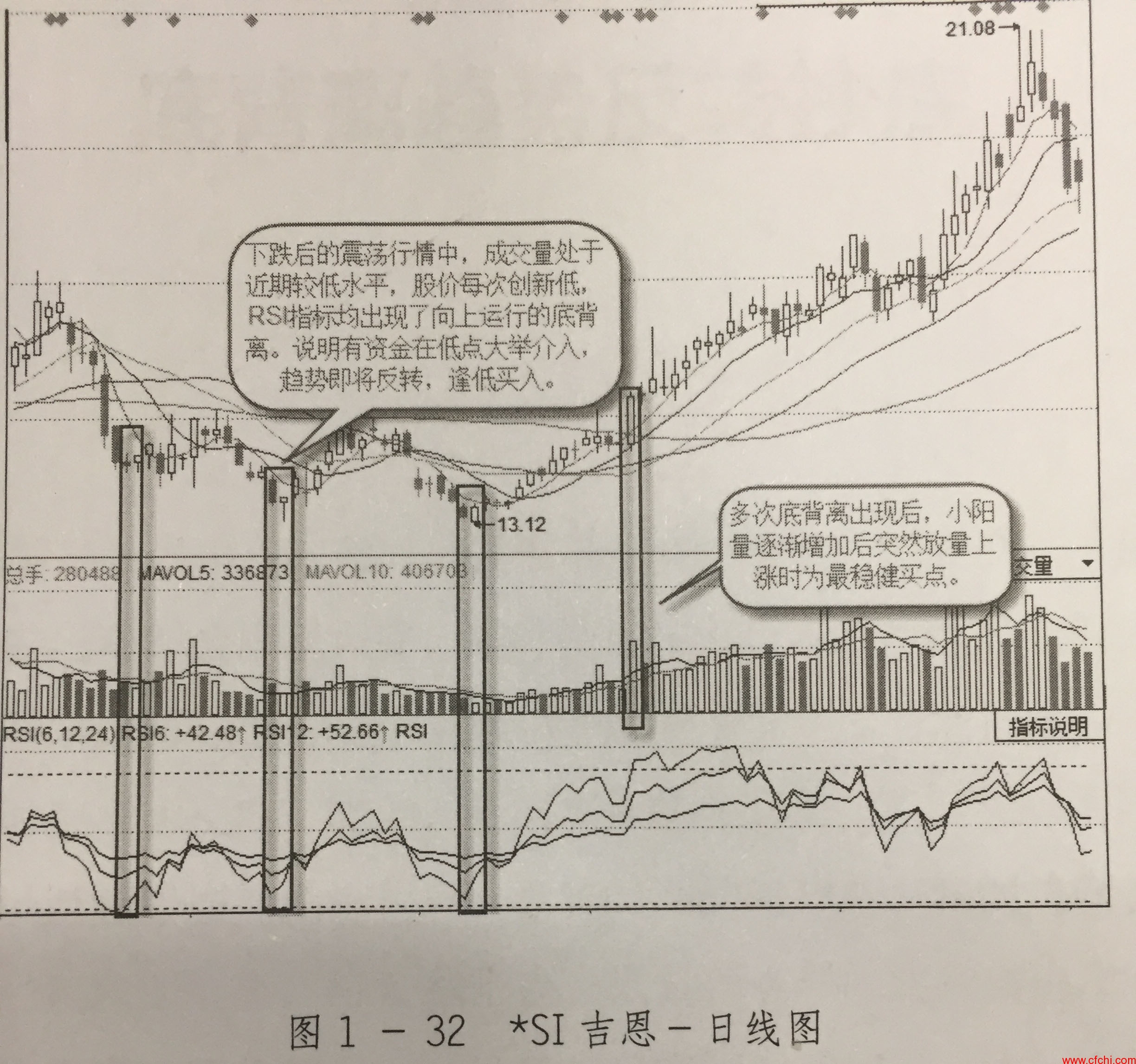 经前期下跌后,*SI 吉恩步入震荡行情的2014年12月,成交量已处于较低水平,RSI线也在低位呈小幅震荡运行。股价每次震荡下跌创出一个明显的新低时,技术指标RSI却均出现了向上运行的底背离,一共出现了3次,形成多次底背离。这就说明,有资金在低点大举介入,主力开始介入,趋势即将出现由弱转强。因此,投资者应在多次底背离出现后,逢低介入。而稳健的投资者,应在2015年3月6日,*SI吉恩在接连小阳量出现后的放量上涨时选择买入,因为这说明,股价已开始启动上涨,趋势真正开始转变,如图1-32所示。
