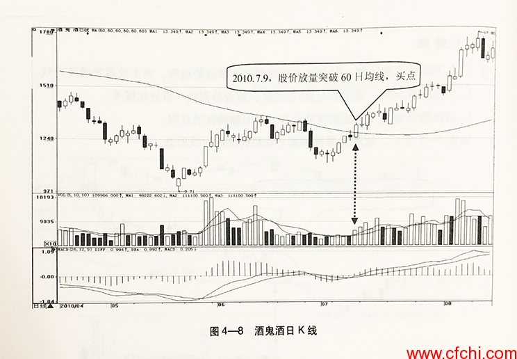 如图4-8所示,在经过底部不断的震荡蓄势之后,2010年7月9日,酒鬼酒(0799)向上放量突破60日均线,发出看涨信号,表明上涨确实已经基本形成。投资者要注意把握这个买点。