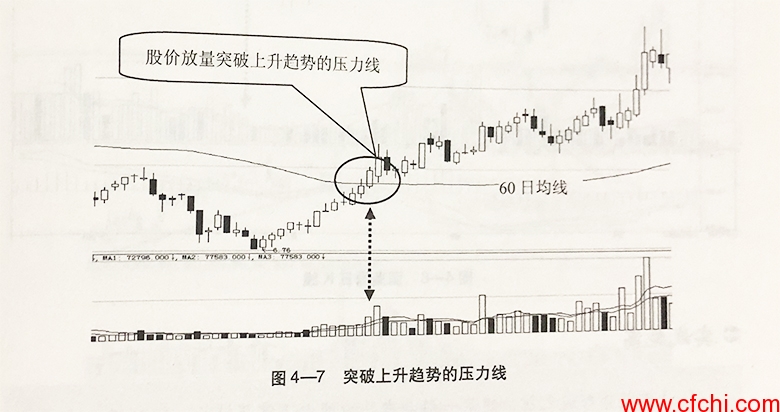 如图4-7所示,这种走势即突破上涨趋势的压力线形态。
