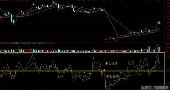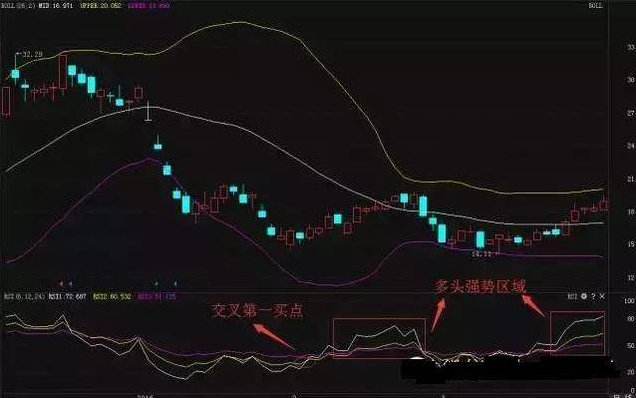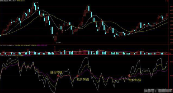 RSI指标通常都有三条不同周期的RSI线组成,分别分为短中长 RSI线,当短中长期RSI处于20以下时,且短期RSI上穿中期RSI为第一个买点,当短中长期RSI处于多头排列并且超过了50,那就是多头强势区域,具体情况如下图所示:
