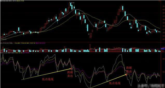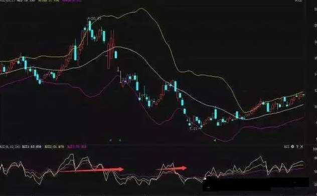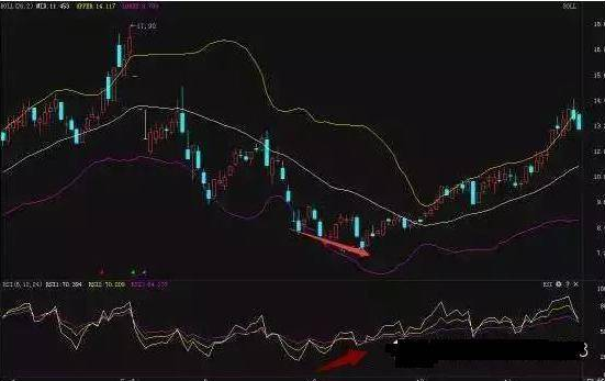 股价一波比一波低,相反的,RSI却一波比一波高,这是底背离,股价出现反转的概率比较大。相反就是顶背离,下图案例就是底背离: