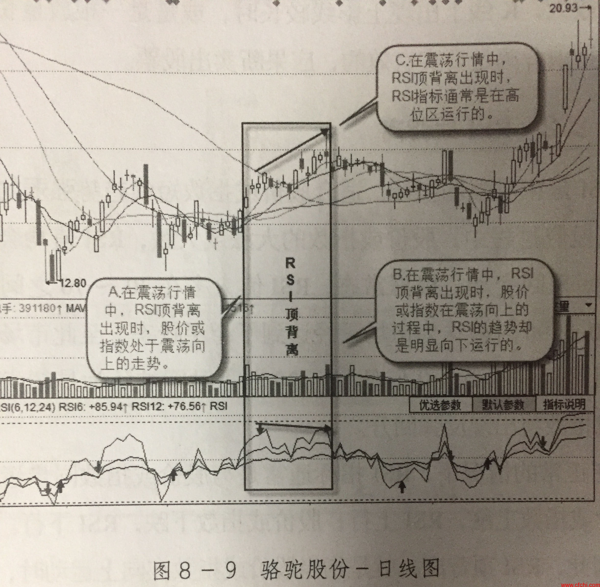 在2016年1月中旬,骆驼股份进入了震荡行情, 并且自3月开始震荡上涨后,股价-路震荡上行,但到了4月3日时,股价最高达到了17.40元,超过了3月23日时最高16.15元的价格,但技术指标RSI却未能超越3月23日时的高点, 与股价运行趋势相反的向下运行,形成RSI顶背离。这说明经过多次的上涨,尽管股价上涨的幅度并不大,但盘中已出现了严重的超买现象,因此导致了卖盘的不断增加,表明后市即将出现震荡反转向下。因此,投资者应当在RSI顶背离出现时,及时卖出手中股票,因为波段高点已经到来,如图8 - 10所示。