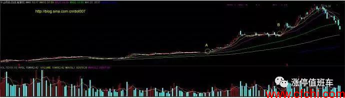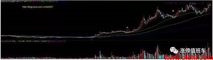 如上图,这是中科新材在2015年的一段走势,AB两点都是主升浪的启动点。我们观察会发现:此两点都是多头调整到20日均线,短线系统粘合的点,(短线系统是指5,10,20日均线多头排列),其中具备的一些条件就是,首次主升必选先放量,二次主升必须是缩量回调之后再次放量,股价必须攻击5日线成功,最后是5,10,20日均线一次多头排列,K线必须漂亮。