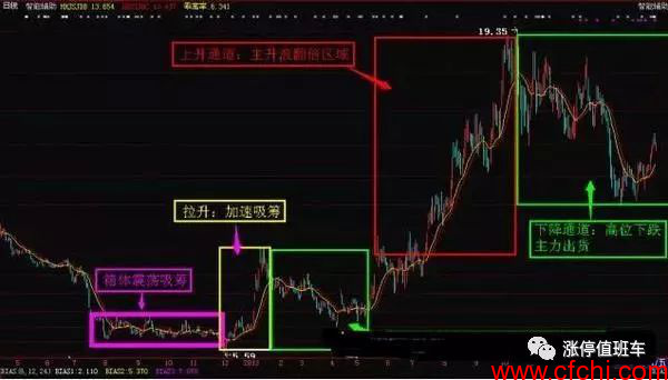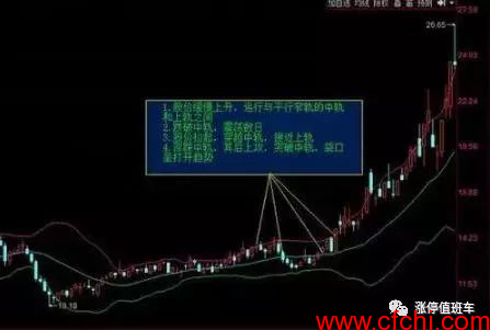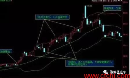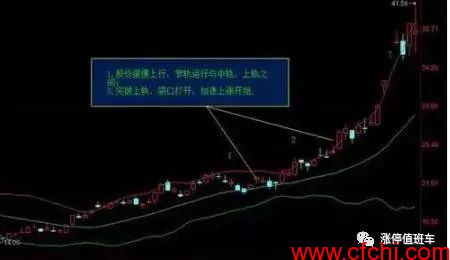 4、对于上述三种刚进入加速后的股票,尖顶回落中轨,往往是买入机会,其后至少有一次上攻,上攻力度强,能够再次攻击上轨,则构成上升通道,回落中轨都可再次买入;力度弱,构成背离,需出局。这是如何做上升通道中的强势股的方法,可参考以下图例: