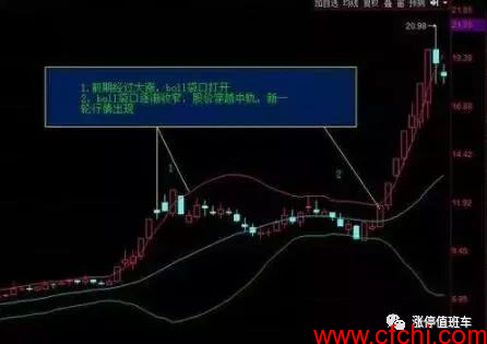 2、股价横盘震荡或缓慢上行,BOLL呈现平行窄轨,股价运行在BOLL的中轨和上轨之间,某日突然加速,突破上轨,BOLL的袋口(上下轨)也呈打开的态势,此时发生行情的概率较大。这是经典的加速上涨形态,可参考以下图例:
