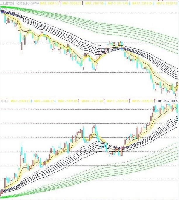 指标在反K线上进行顾比平均,操作时多参考使用,一定有助于客观决策,克服一厢情愿的主观决定。特别在均线粘合的关键点,对于果断、正确决策大有帮益!!!