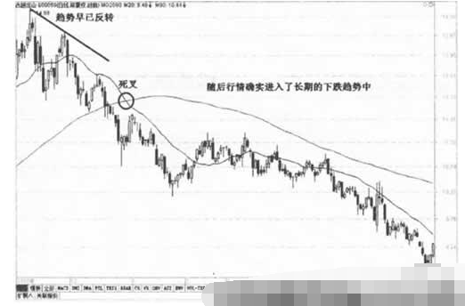 和黄金交叉一样,实战中交易者也要注意区分普通交叉和死亡交叉。短期均线由上而下穿越长期均线不一定是死亡交叉,死亡交叉必须满足两个条件: