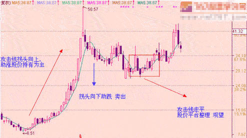 所谓攻击线就是我们日常所说的5日均线。但攻击线也可用于分时、周线、月线甚至是年线,如果你是中线持股者五周线就是你的攻击线,其他依次类推。攻击线作用有三个,攻击线拐头向上表示其有助涨左右,攻击线走平意味着股票正在做平台整理,拐头向下代表其有助跌作用,值得注意的是,在大盘系统较稳定的情况下自己要选择攻击线陡峭向上的个股,斜率大上涨速度快,赚钱速度快。接下来我们拿一个案例来分析: