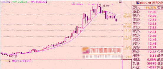 000570,苏常柴,2009年走势周线图,股价一直沿着操盘线走出了波澜壮阔的行情,一年的时间从3元涨到35元(股价做了复权处理)