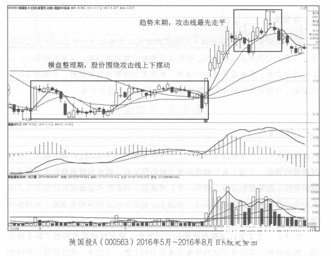 在上升趋势中一旦股价出现了滞涨,攻击线会最先走平,呈现出上涨无力的走势;在下降趋势中一旦股价出现了止跌,攻击线会最先走平,呈现出下跌无力的走势;在横盘震荡期间,股价维持在攻击线之上或者之下的时间不长,股价会围绕攻击线上下波动。