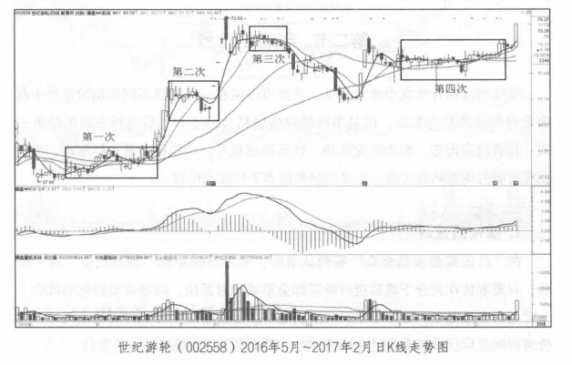 如图所示,世纪游轮(002558)先是在相对低位走出了4根均线粘合的走势,之后向上选择了方向,在上升趋势的运行过程中,生命线和决策线的角度没有办法跟上攻击线和操盘线的角度,所以攻击线和操盘线必然需要调整,以等待生命线和决策线“跟上”。